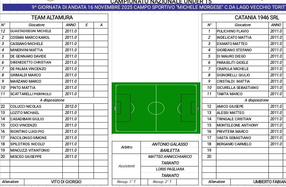 Altamura e Catania si sono sfidate questa mattina (Gara categoria Under 15 Serie C – Girone D – Giornata nr. 9 di Campionato).