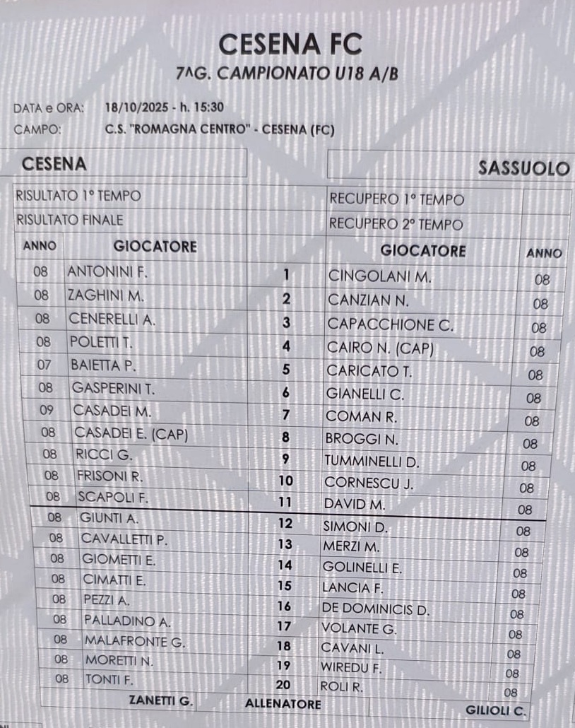 Il Cesena U18 del tecnico Zanetti batte 2-1 il Sassuolo U18 di mister Gilioli.