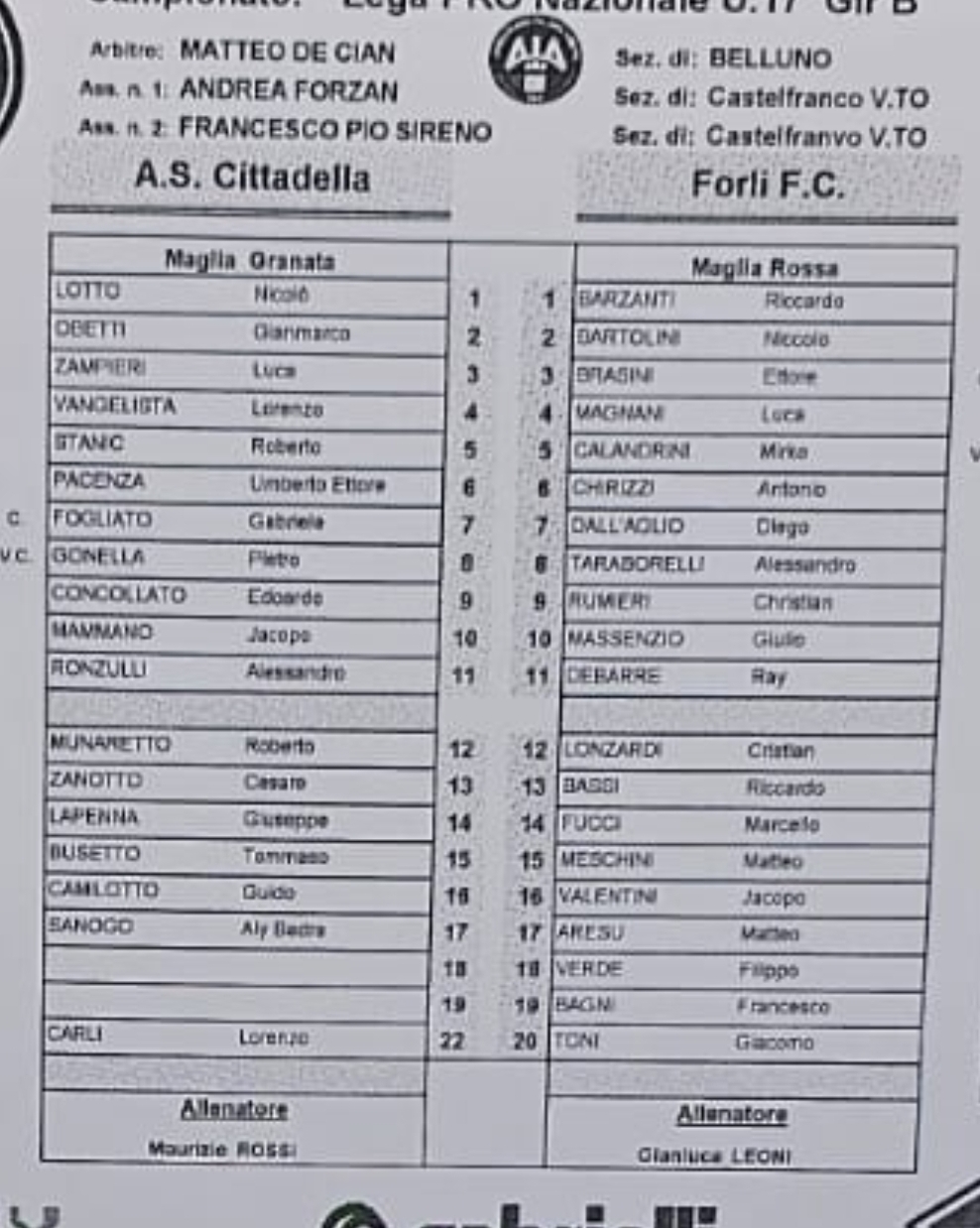 Cittadella-Forli’ – Distinta gara Under 17. La sfida si è giocata in Veneto nella giornata di domenica 28 settembre.