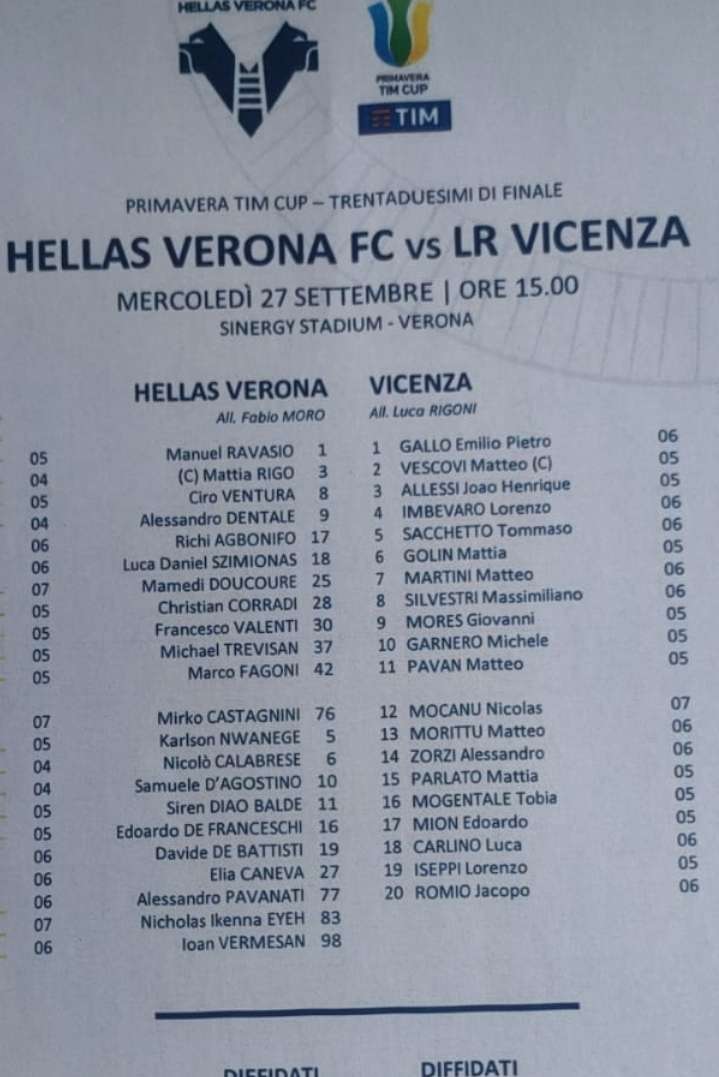 Matteo Martini, classe 2006, ad inizio ripresa raddoppia per i berici, poi l’Hellas di mister Fabio Moro accorcia con Agbonifo, il Vicenza sigla il 3-1 con Edoardo Mion, infine altra rete di marca scaligera con Valenti ed il match si chiude 2 3 per gli ospiti biancorossi. Da segnalare 2 legni per l’Hellas (una traversa nel recupero) e un palo colpito dal Vicenza nel secondo tempo,