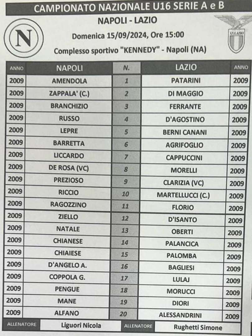 DISTINTA – Napoli vs Lazio (Under 16). Di seguito le formazioni ufficiali delle due compagini che si sono affrontate domenica 15 settembre