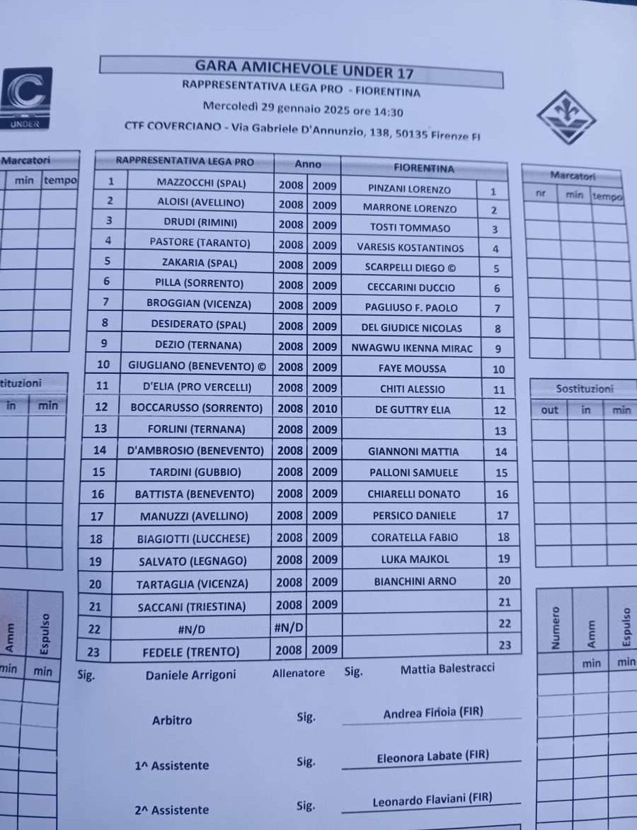 Distinta – Si è giocata questo pomeriggio alle 14:30 la gara amichevole tra l’Under 17 della Rapp. Lega Pro e l’Under 16 della Fiorentina.