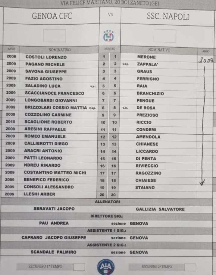 Distinta di Genoa vs Napoli che si è giocata al “Begato 9” questa mattina alle ore 11:00 (Campionato Under 15 A-B – 1^ giornata – ).