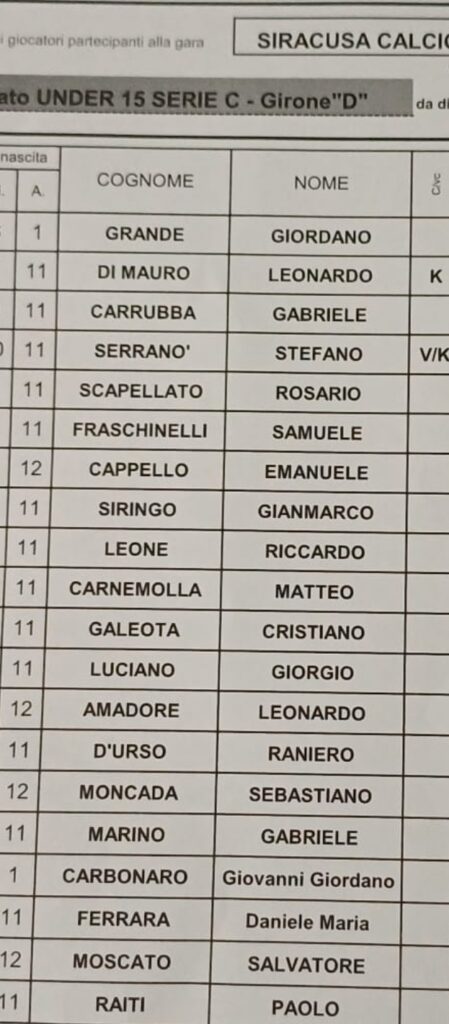 Il Siracusa U15 di mister Amodio ha battuto il Giugliano U15 nello scorso week-end. Di seguito la distinta del match Under 15.