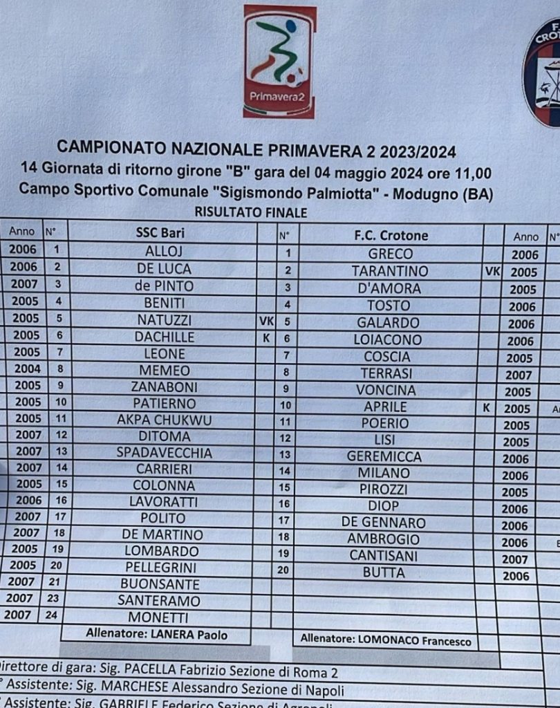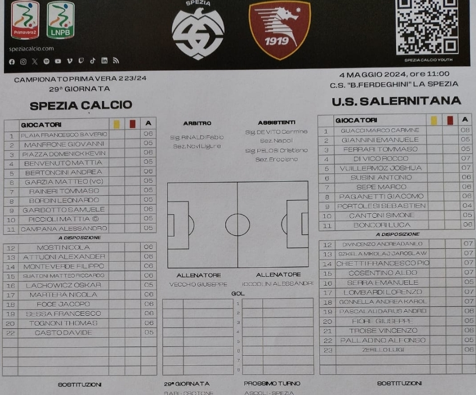 DISTINTE (Primavera 2): Spezia-Salernitana-Bari-Crotone e altre. Ecco alcune formazioni ufficiali (Girone B).