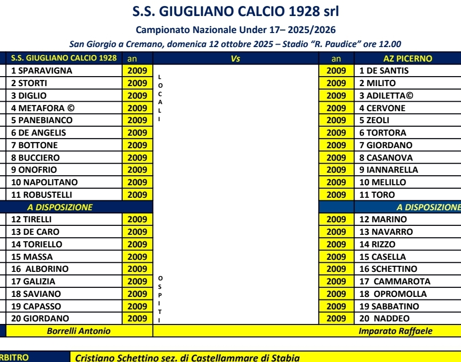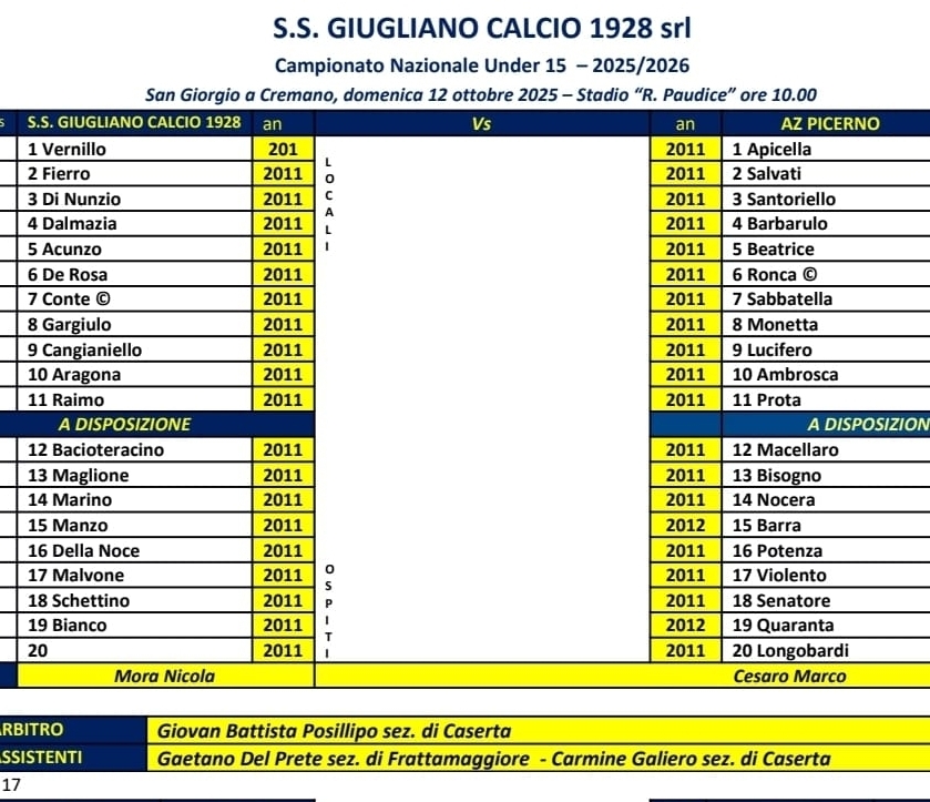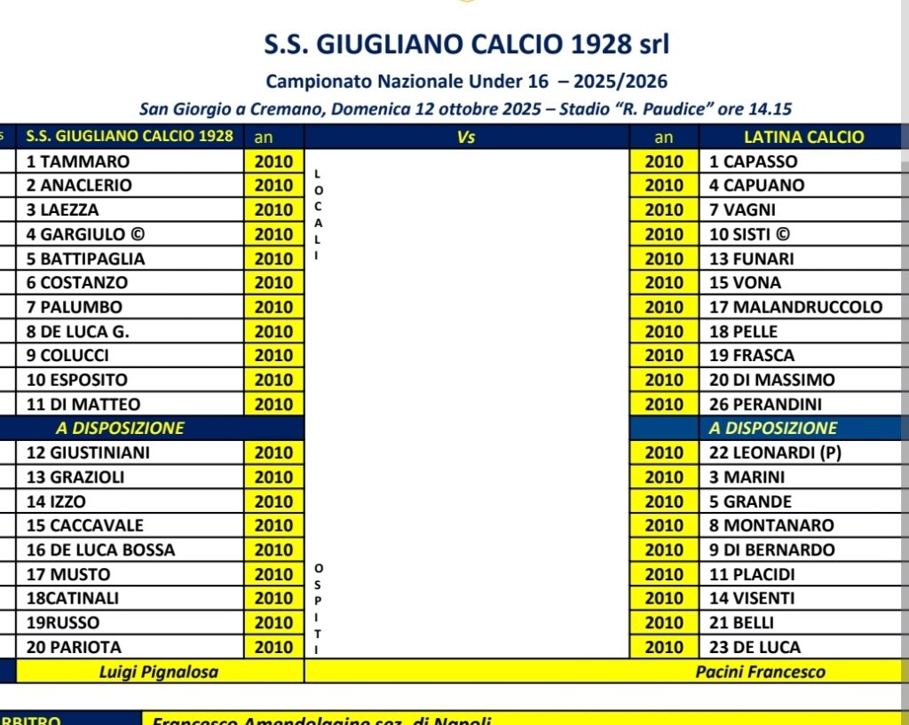DISTINTE – Nello scorso week end si sono giocate le gare Under 15-17 Giugliano-Picerno e Under 16 Giugliano-Latina.