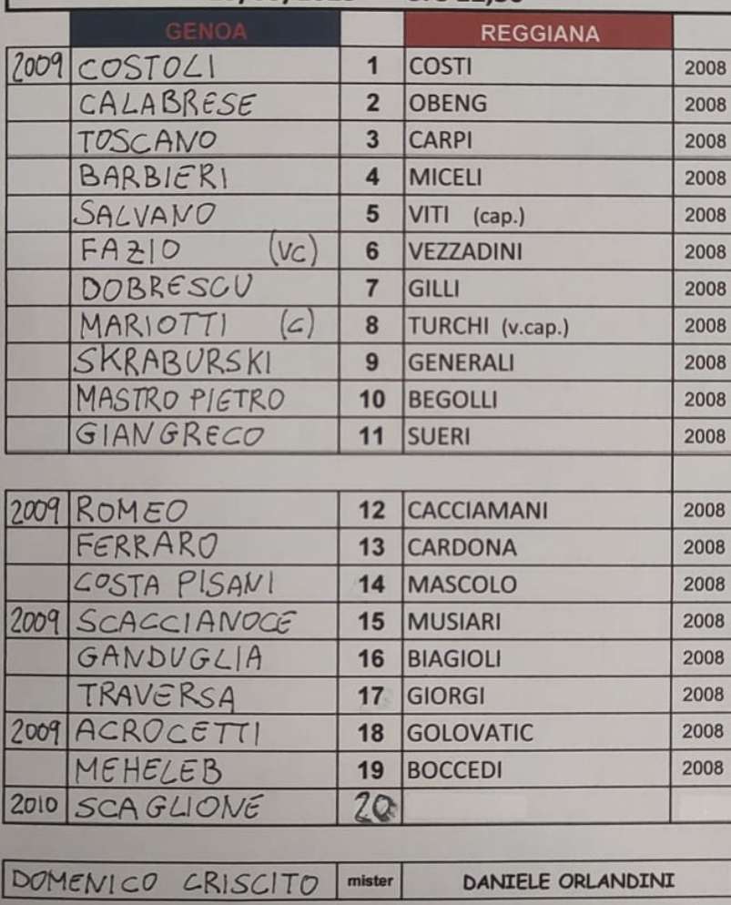 Al centro sportivo “Begato 9” di Genova si è giocata la gara Genoa Reggiana nella giornata di domenica 23 marzo. Ecco la distinta.
