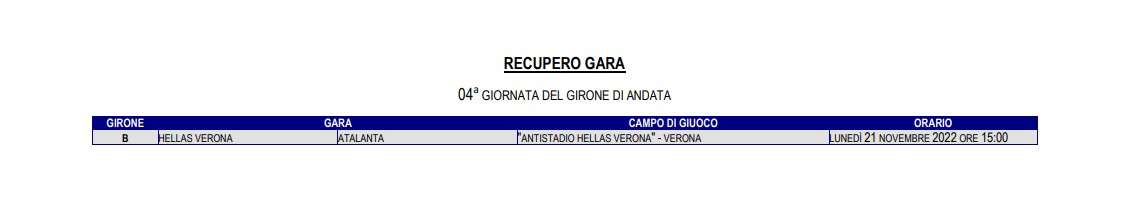 CON IL COMUNICATO ODIERNO N. 43 LA FIGC HA RESO NOTO LA DATA DEL RECUPERO H. VERONA-ATALANTA VALIDO PER LA 4° G. DEL CAMPIONATO U 18 A-B.