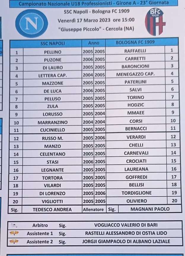 Napoli e Bologna giocano quest’oggi in anticipo la gara nr. 23 del Campionato Under 18 A-B.