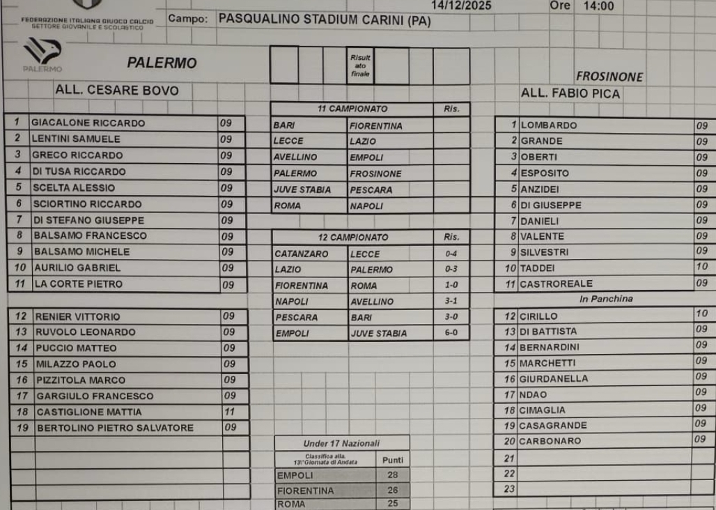 Palermo-Frosinone (Under 17): distinta della gara. Il match si è giocato in Sicilia nella giornata di domenica 14 dicembre.