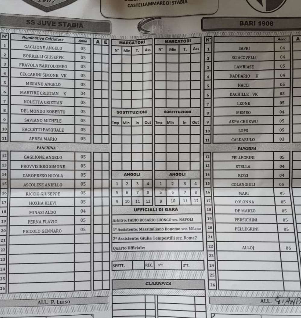 Primavera 3 – Di seguito le distinte dei due match Foggia Potenza e Juve Stabia Bari che si sono disputati sabato 15 aprile