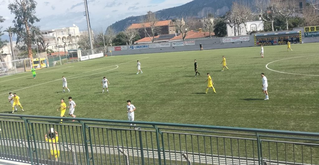 Scampato il pericolo al 10′ Sorrento si porta in vantaggio: cross al centro di Petrone ed il n.5 Amendola di prima intenzione la mette dentro!