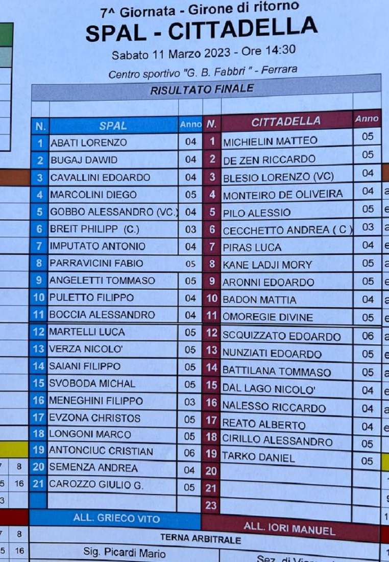 La Primavera della Spal del tecnico Vito Grieco ha affrontato quest’oggi al “Fabbri” (ore 14:30) il Cittadella del tecnico Iori.