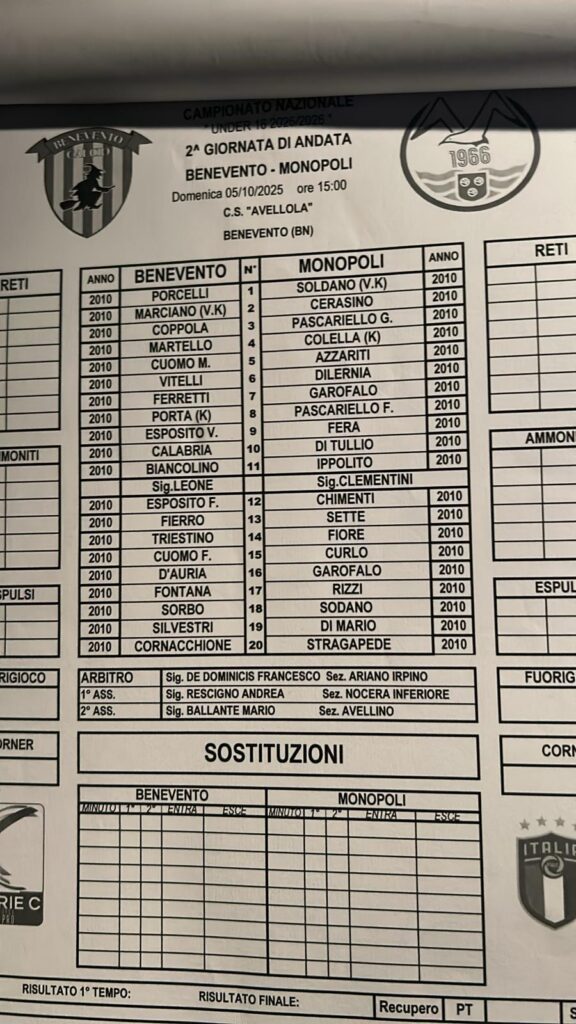 UNDER 16 (Serie C) – Distinte Benevento, Monopoli e Picerno. Ecco le formazioni ufficiali del 5 ottobre (2^ giornata).