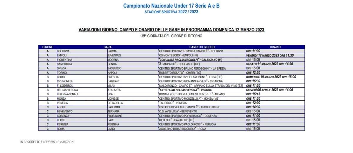 CON IL COMUNICATO ODIERNO NUMERO 89 LA FIGC HA RESO NOTO IL PROGRAMMA GARE DELLA 22° GIORNATA DEL CAMPIONATO UNDER 17 A-B