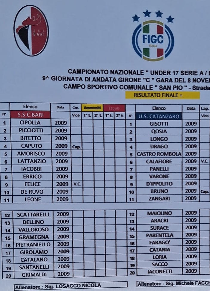 Under 17 A-B – Alle ore 11:00 di questa mattina si è giocata la gara Bari-Catanzaro, valida per la giornata nr. 9 di campionato (Girone C).