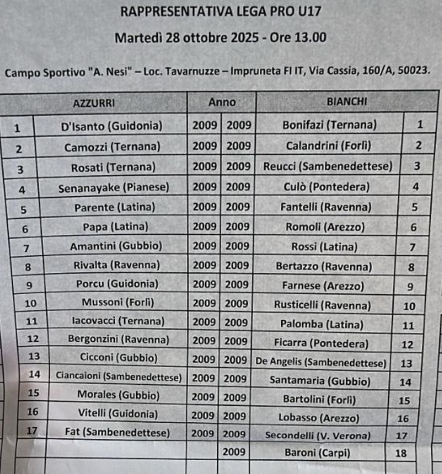 Under 17 – La Rappresentativa Lega Pro, nello scorso 28 ottobre, ha disputato uno stage in famiglia, ecco la distinta dell’amichevole.