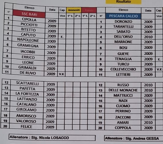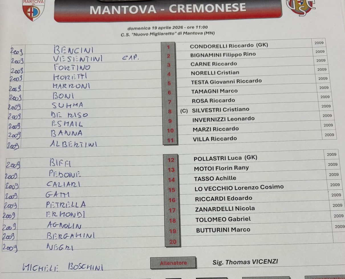 Under 17 – Di seguito le distinte dei due match: MANTOVA-CREMONESE e BARI-PESCARA del 19 aprile (Girone B e C).
