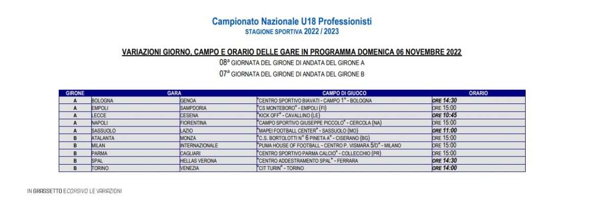CON IL COMUNICATO ODIERNO NUMERO 43 LA FIGC HA RESO NOTO IL PROGRAMMA GARE DELL’8° GIORNATA DEL CAMPIONATO UNDER 18 A-B.