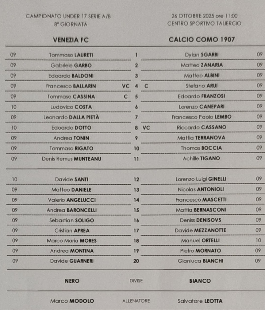 Al centro sportivo “Taliercio” di Mestre, in località Cavergnago, ed è intitolato alla memoria di Giuseppe Taliercio, dirigente d’azienda ucciso dalle Brigate Rosse, si è giocata alle 11:00 di domenica 26 ottobre la gara Venezia-Como, valida per la giornata n.8 del Campionato U17 A-B (Girone B).